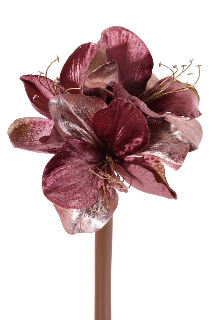 Amaryllis 'Glamour', 3 flores Ø 9 cm, a. 14 cm, (terciopelo y poliéster), estambres de plástico dorado, 69 cm