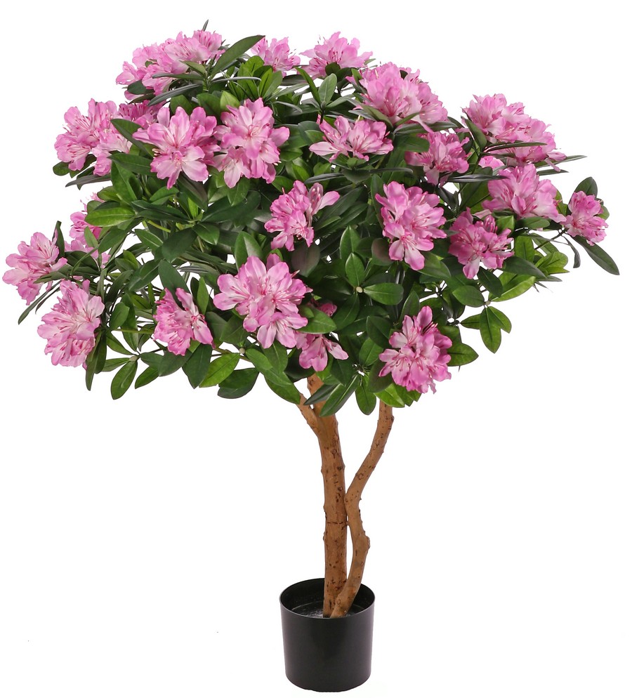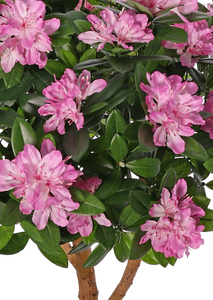 Planta de rododendro 'Bloom' con tronco de madera auténtica, 1.026 hojas y 36 flores grandes, altura 115 cm, en maceta