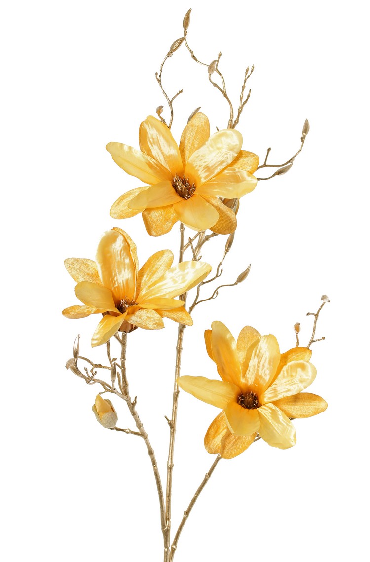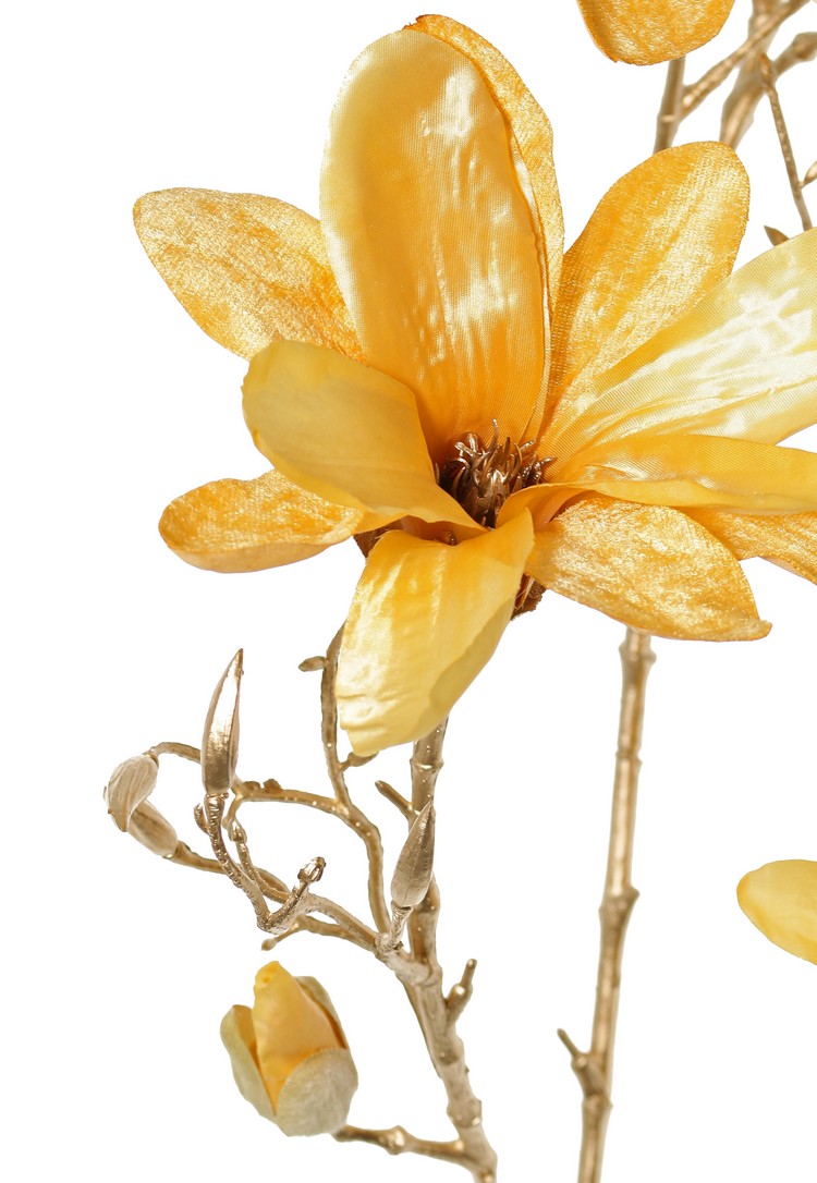 Branche de magnolia (velours & satin) avec 3 fleurs, 2 boutons floraux & 20 boutons en plastique, tige dorée 115 cm